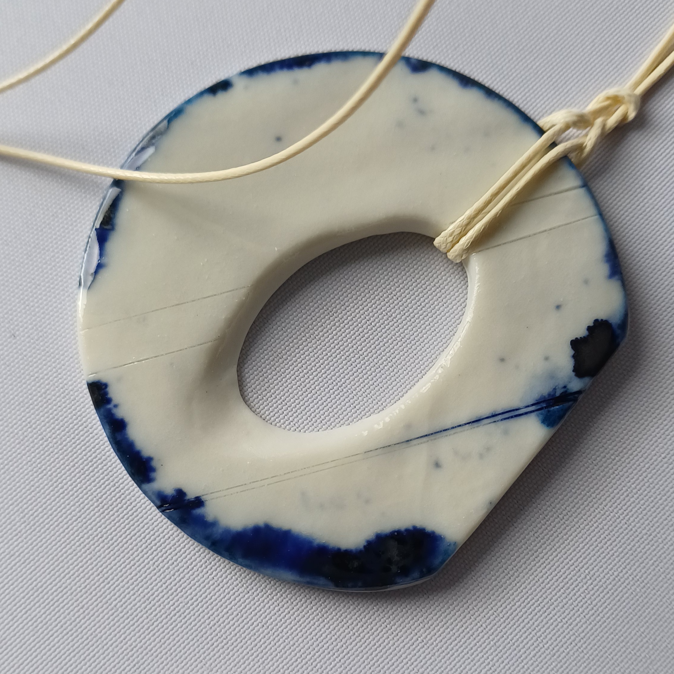 Figura modelada i pintada a mà, fil de polièster i abalori de plata. Diàmetre aproximat 7cm.