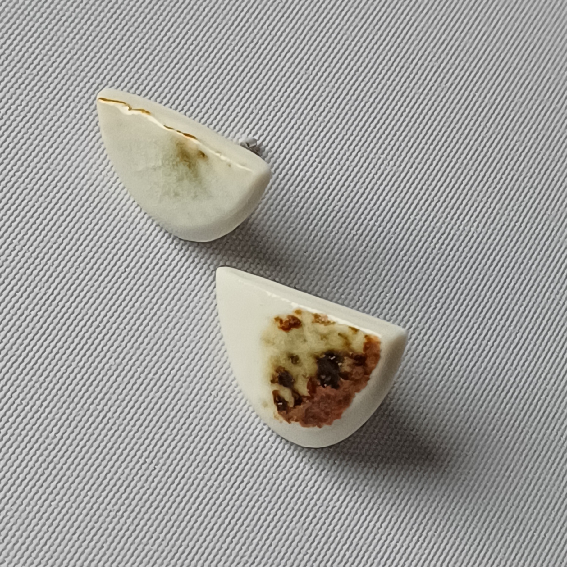 Arracades desiguals de porcellana modelades i pintades a mà. Base i tanca de pressió de plata.